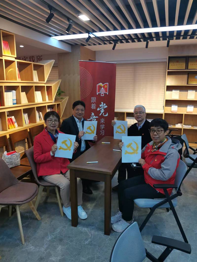 参观以后,党员们围坐拢来,用手机打开“学习强国”,进行了 “党的二十大精神答题活动”,同志们认真答题,还互相进行了一次小小比赛。接下来,来恩浩同志结合二十大精神学习,讲了专题党课《与时俱进,二十大党章的重要修改》,围绕新党章50项修改内容,一一阐明,同志们听得认真,时不时地参与讨论。学完党章,钱和娣同志继续领学《党徽党旗条例》活动,特别强调了了党徽党旗的制作和使用规则,同志们边学边记,最后大家拿出准备好的纸笔,“巧手绘党徽”,在这个主题党日中画下了心中的一枚金色党徽。