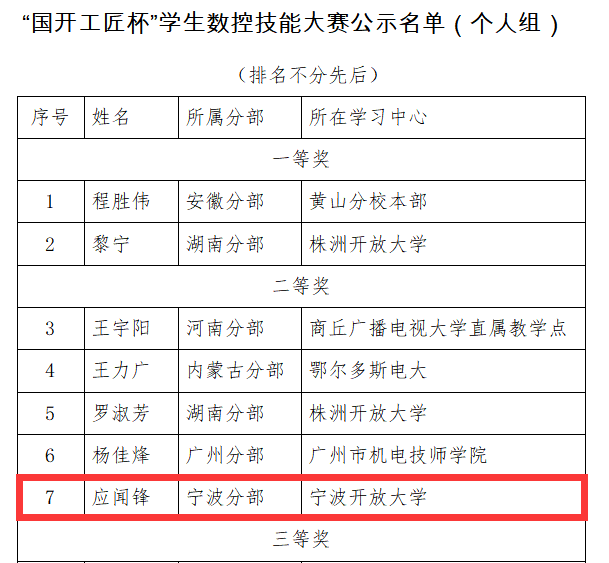 为贯彻落实立德树人根本任务,推动机械类专业教育教学改革,培养学生的实操能力和创新能力,提高人才培养质量,学校积极鼓励学员参加2022年“国开工匠杯”学生数控技能大赛,开放教育学员应闻锋同学在大赛中获个人组二等奖,我校曹浩峰老师获优秀指导教师称号。本次赛事经国家开放大学初审,专家网上初评,专家终审,最终评选出个人组2个一等奖,5个二等奖,12个三等奖。