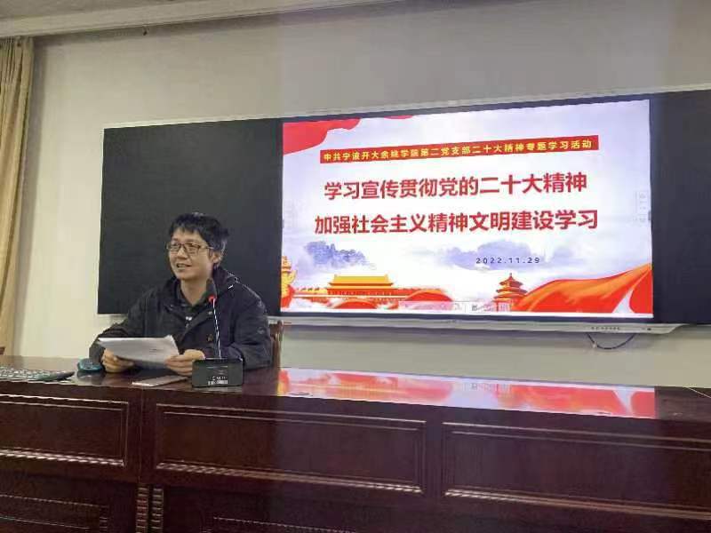 在全国上下深入学习贯彻党的二十大精神之际,按照上级党组织统一部署,余姚开大(社区学院)第二党支部近期开展了党的二十大精神学习暨支部书记上党课活动。支部书记苏建华围绕二十大报告中关于精神文明的论述以及《习近平关于社会主义精神文明建设论述摘编》(以下简称《论述摘编》)中的部分内容,结合学院教育教学管理工作实际,为二支部全体党员上了一堂“加强精神文明建设学习 提升终身教育服务质效”的主题党课。
