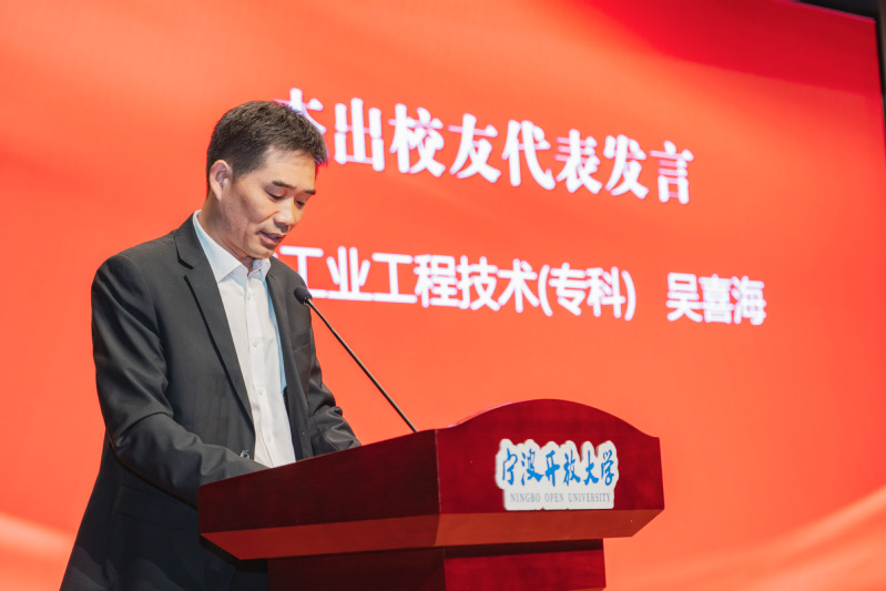2018秋工业工程技术专业专科学员吴喜海作为杰出校友和老生代表发言。吴喜海同学是一位地道的外来务工人员,他学历虽低,但能力出众;他为人低调,但做事却从不含糊。他心系母校,常怀感恩,多次积极参加学校和社会组织的各类活动,先后获得宁波市高技能人才、首席工人,浙江省劳模和全国优秀农民工等荣誉称号。他的发言朴实诚恳,字里行间流露出对母校的感恩、感激之情。
