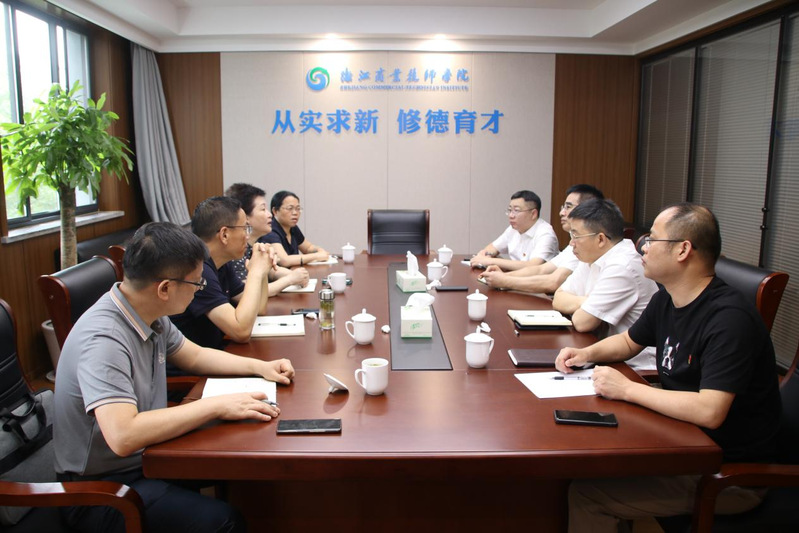 7月6日,校长翁雪莲及校党委委员、副校长陈曙赴浙江商业技师学院开展主题教育专题调研。教务处处长王荷琴、教学中心主任方宇通共同参与调研。浙江商业技师学院党委书记周波、常务副院长严祥和及相关职能处室负责人热情接待了调研组一行。