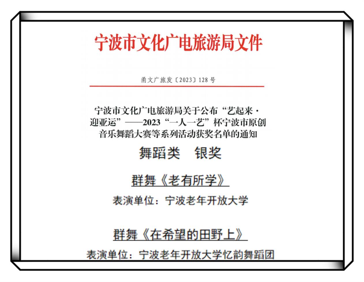 近日,宁波市文化广电旅游局下发《关于“艺起来·迎亚运”——2023“一人一艺”杯宁波市原创音乐舞蹈大赛等系列活动获奖名单的通知》(甬文广旅发〔2023〕128号),由我校夏敏舞蹈工作室编创的两个群舞作品《老有所学》《在希望的田野上》双双喜获银奖。