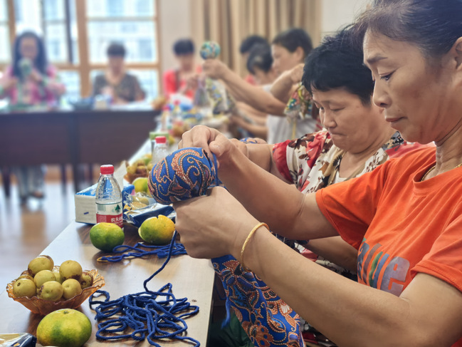 授课老师先给大家讲了一下艾草锤的养生方法和好处:可以安神理气,疏通经络;可以祛湿散寒,促进气血运行等。然后,她打开视频,教大家先对照一下自己的材料包,跟着她一步一步操作。老人们都是针线高手,掌握了方法后,药草锤就慢慢在他们手里成型了。畲族阿姨兰翠仙已是余姚老居民了。20岁就嫁过来的她,一口余姚方言已说得难辨真伪。她拿起锤子捶打了两下肩颈,高兴地说:“这下好了。以后让我孙子每天给我捶背去。”