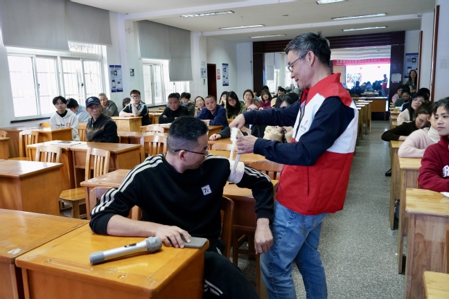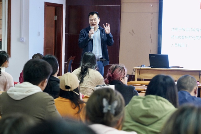 学员回到教室后,余姚市红十字会卢鸿救护师给全体学员及员工进行了情景式应急救护技能培训,重点培训了受伤后的止血、包扎、固定、搬运四个步骤的处理方法。卢老师讲解幽默风趣,生动形象,知识和技能传达效果良好。学员们都全神贯注地听讲,培训达到预期目的。培训结束后,红十字会还为全体学员发放了急救包,人手一个,进一步增强了大家应对紧急情况的能力。