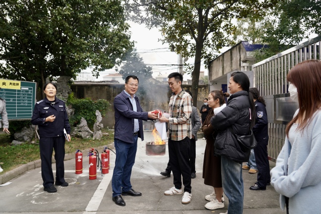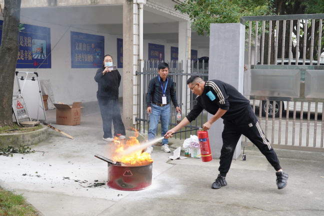 随后开展灭火培训,此次培训用比赛形式以增加趣味性。学员被分为红蓝两队,裁判长叶主任宣布比赛规则后,由消防兵出身的本校员工钱庆国进行灭火演示,接着每组各派出三位代表参与灭火演练,计时员记录时间,最后评选出获胜小组和个人冠军,并颁发奖品。