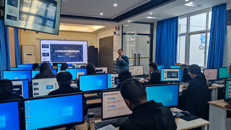 培训中,信息中心处朱波老师为大家讲述了人工智能的发展历程,分析了人工智能的原理与技术发展以及人工智能的应用领域。他表示,人工智能在多个行业都发挥着重要作用。在教育领域,智能辅导系统能实现个性化教学,根据学生的学习特点和进度提供定制化的学习方案;自动批改作业系统不仅提升了教育的效率,也为教师提供了更多的时间和精力进行教学创新和学生指导。同时,朱波老师也指出了人工智能目前面临的挑战,如数据隐私与安全问题、就业结构的调整以及技术发展的不确定性等。