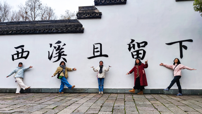 在网红打卡点“西溪且留下”白墙前,老师们纷纷合影留念。他们有的两两结伴,笑容满面地定格下这一美好瞬间;有的摆出创意十足的姿势,为春日之行增添了一抹别样的色彩。在欢声笑语中,平日里严谨认真的同事们展现出了轻松活泼的一面,彼此之间的距离也进一步拉近。