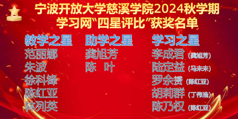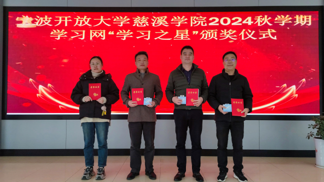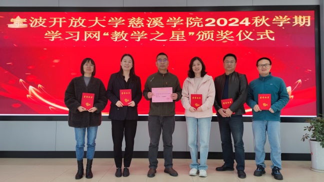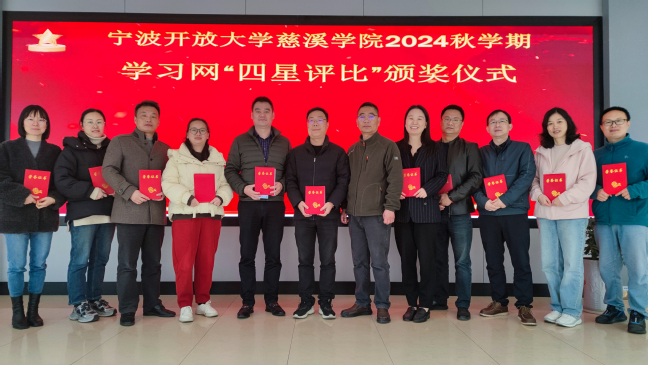 慈溪学院在2024年秋学期开放教育学习网活动中,凭借卓越的组织管理、优质的教学成效、暖心的助学服务以及学员们积极进取的学习风貌,收获多项荣誉。其中,范丽娜、朱波、徐科锋、陈红亚、林列英等老师凭借精湛的教学能力与出色的教学服务,获“教学之星”称号;龚旭芳、陈叶以贴心细致的助学服务,赢得“助学之星”荣誉;李成君、陆定益、罗余赟、胡莉群、陈乃权等学员凭借持之以恒的学习热情与优异的学习表现,获评“学习之星”。此外,学院以严谨高效的组织管理,确保开放教育学习网活动的有序推进,被评为2024秋学期学习网“组织之星”称号。