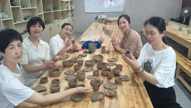 在实践环节,学员们化身“当代匠人”,在专业导师的指导下揉泥、拉坯、塑形。陶泥在指尖流转,渐渐蜕变为茶盏、花瓶等器物的雏形。“泥土是有生命的,要用心感受它的韧性。”老年学校学员王阿姨专注地修整坯体纹路,笑称“仿佛与千年前的工匠有了共鸣”。现场还融入了“千年象窑”郑亚丽能人工作室的创新理念,鼓励学员在传统器型中加入现代元素,让非遗焕发新生机。