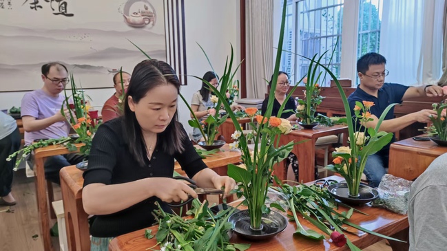 活动现场,各色鲜花娇艳欲滴,剪刀、插花器、陶瓷碗等工具一应俱全。慈溪木兰花坊的花艺师通过理论讲解与现场演示,细致传授了中国传统插花“碗花”的制作技巧——从花材选择、色彩搭配,到高低层次布局、整体造型设计,老师们认真聆听,不时记录要点。
