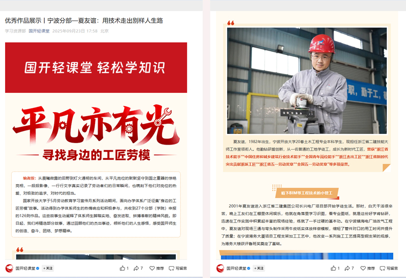 为进一步弘扬劳模精神、劳动精神、工匠精神,落实立德树人根本任务,营造人人皆可成才、人人尽展其才的良好环境,国家开放大学于今年5月组织开展劳动教育学习宣传月系列活动,向办学体系广泛征集“寻找身边的工匠劳模”故事。活动共收到27个分部(学院)申报的126则作品,我校推荐的夏友谊、史朋飞2个“工匠劳模故事”全部入选,部分优秀作品已在“国开轻课堂”等平台展示。