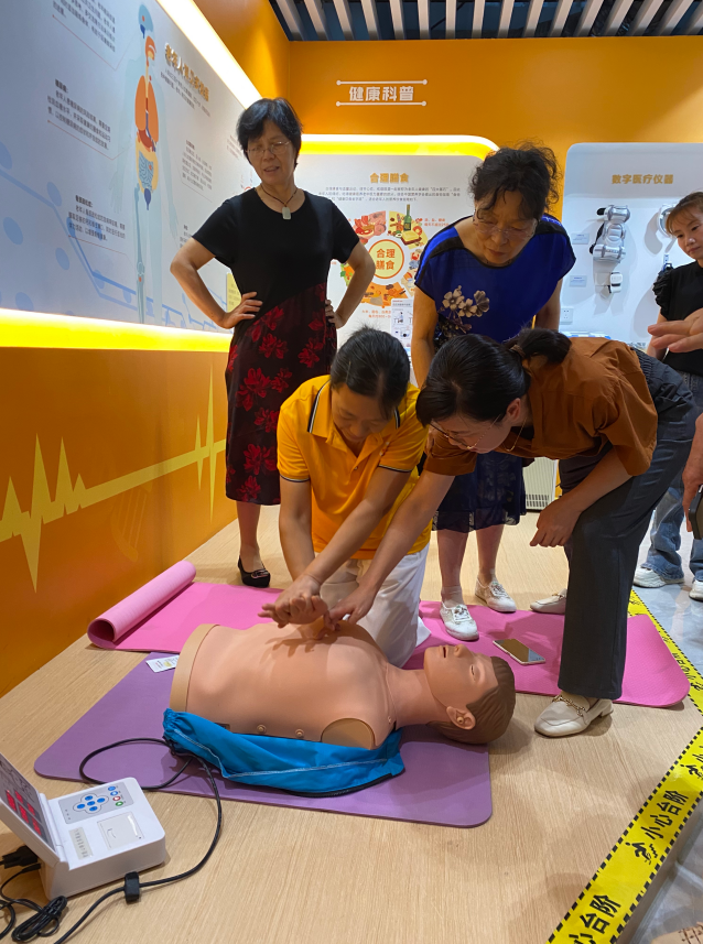 医疗健康体验区同样人气高涨。在心肺复苏与AED使用学习区,老年学员全程专注。讲师先讲解心肺复苏的操作流程、按压位置与力度,再演示AED开机、电极片粘贴、按键操作等关键步骤。学员们逐一上前,在模拟人身上练习按压与吹气,讲师实时纠正姿势,强调“动作标准才能救命”。“这些急救知识太实用了,在家在外都能用上!”参与实操的李叔叔感慨道。