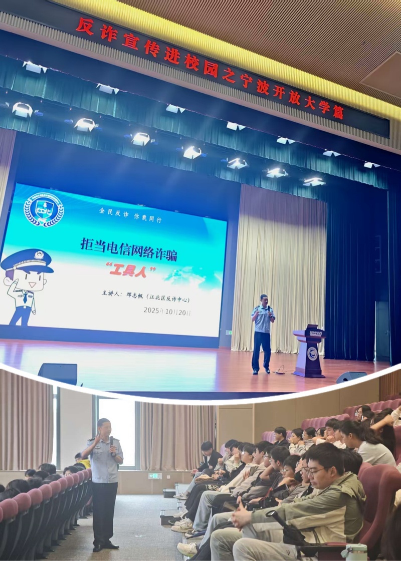 10月20日,我校邀请宁波市江北区公安局司法鉴定中心教导员、一级警长、金牌讲解员邓志帆警官来校面向在校师生进行反诈宣传教育。