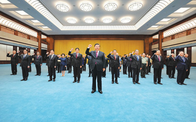 6月18日,党和国家领导人习近平、李克强、栗战书、汪洋、王沪宁、赵乐际、韩正、王岐山等在中国共产党历史展览馆参观“‘不忘初心、牢记使命’中国共产党历史展览”。这是参观结束后,习近平带领党员领导同志一起重温入党誓词。 |