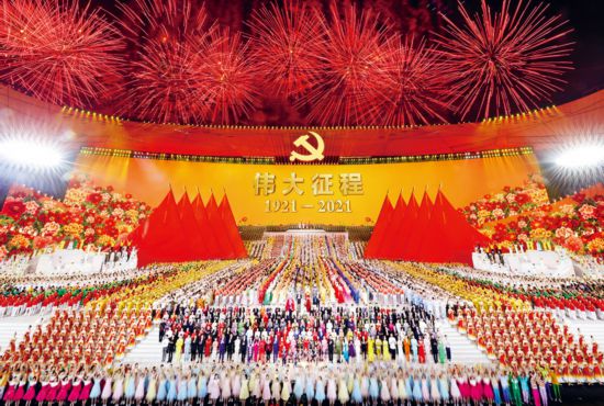 在百年奋斗历程中,中国共产党团结一切可以团结的力量、调动一切可以调动的积极因素,最大限度凝聚起共同奋斗的力量,推动着中国发展进步的历史车轮滚滚向前。2021年6月28日晚,庆祝中国共产党成立100周年文艺演出《伟大征程》在国家体育场盛大举行。图为文艺演出结束,全场共同高唱《没有共产党就没有新中国》。 新华社记者 庞兴雷/摄