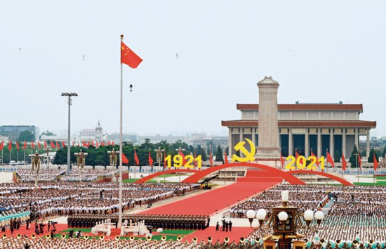 我们党的百年奋斗史,就是一部为中国人民谋幸福、为中华民族谋复兴的历史,一部践行初心使命的历史,一部与人民心连心、同呼吸、共命运的历史。图为2021年7月1日上午,庆祝中国共产党成立100周年大会在北京天安门广场隆重举行。 新华社记者 兰红光/摄