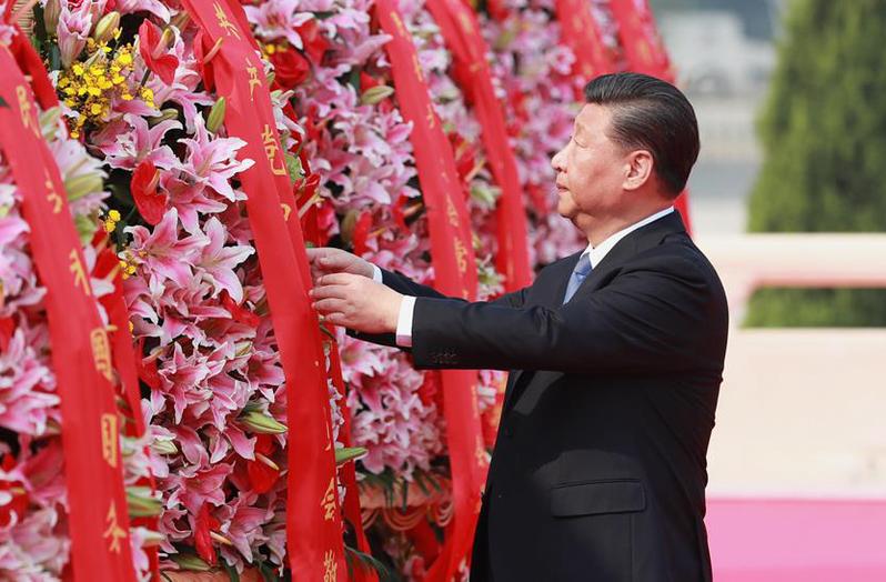 习近平迈步向前,仔细整理花篮缎带。接着,习近平等党和国家领导人缓步绕行,瞻仰人民英雄纪念碑。